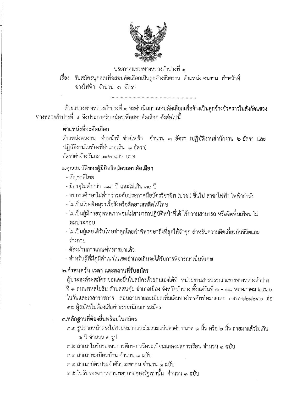 ประกาศแขวงทางหลวงลำปางที่ ๑ รับสมัครบุคคลเพื่อสอบคัดเลือกเป็นลูกจ้างชั่วคราว ตำแหน่ง คนงาน ทำหน้าที่ ช่างไฟฟ้า จำนวน ๓ อัตรา