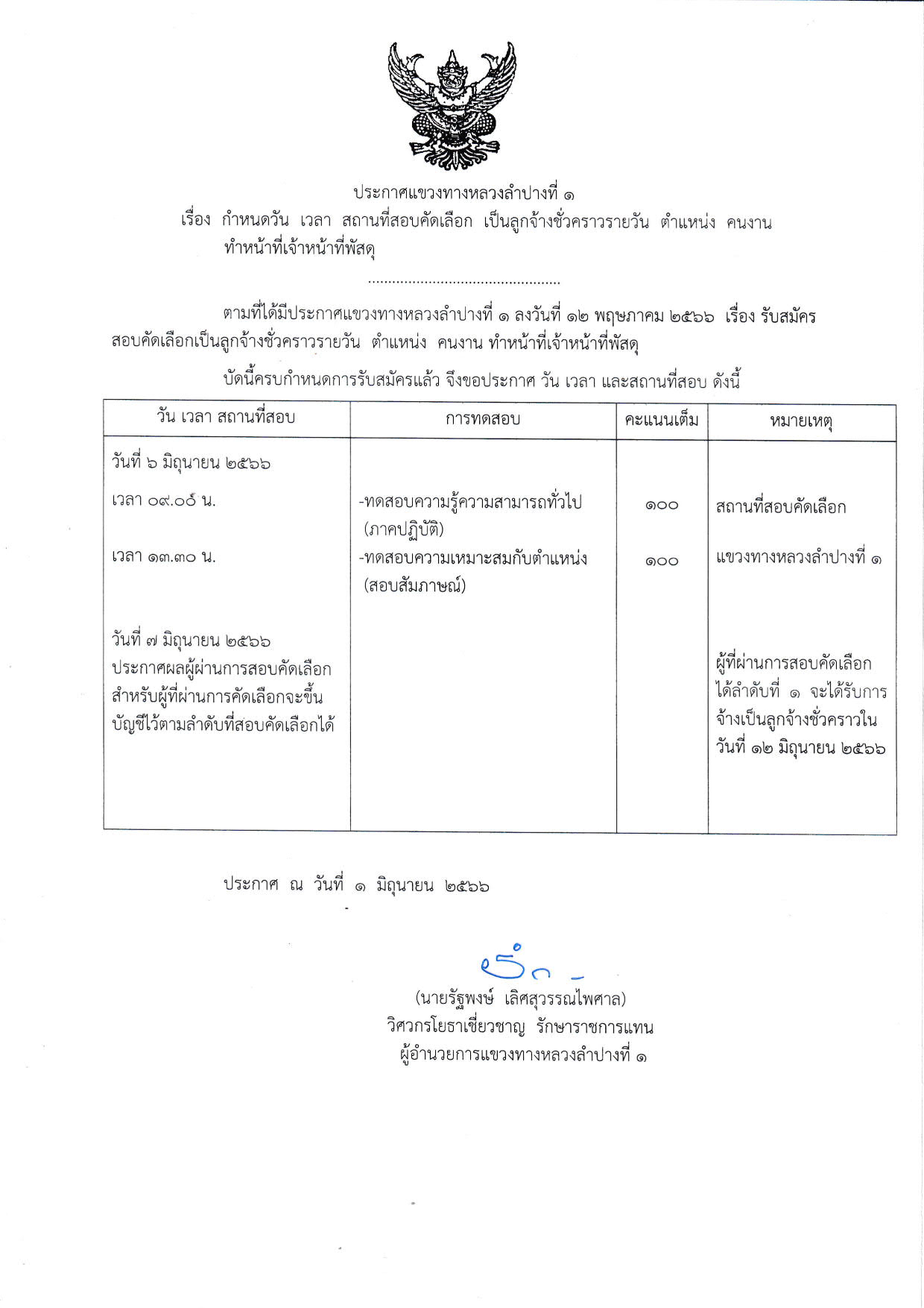 เพื่อบรรจุบุคคลเป็นลูกจ้างชั่วคราวรายวันดังกล่าว ในวันที่ ๖ มิถุนายน ๒๕๖๖ เวลา ๐๙.๐๐ น. เป็นต้นไป ณ แขวงทางหลวงลำปางที่ ๑