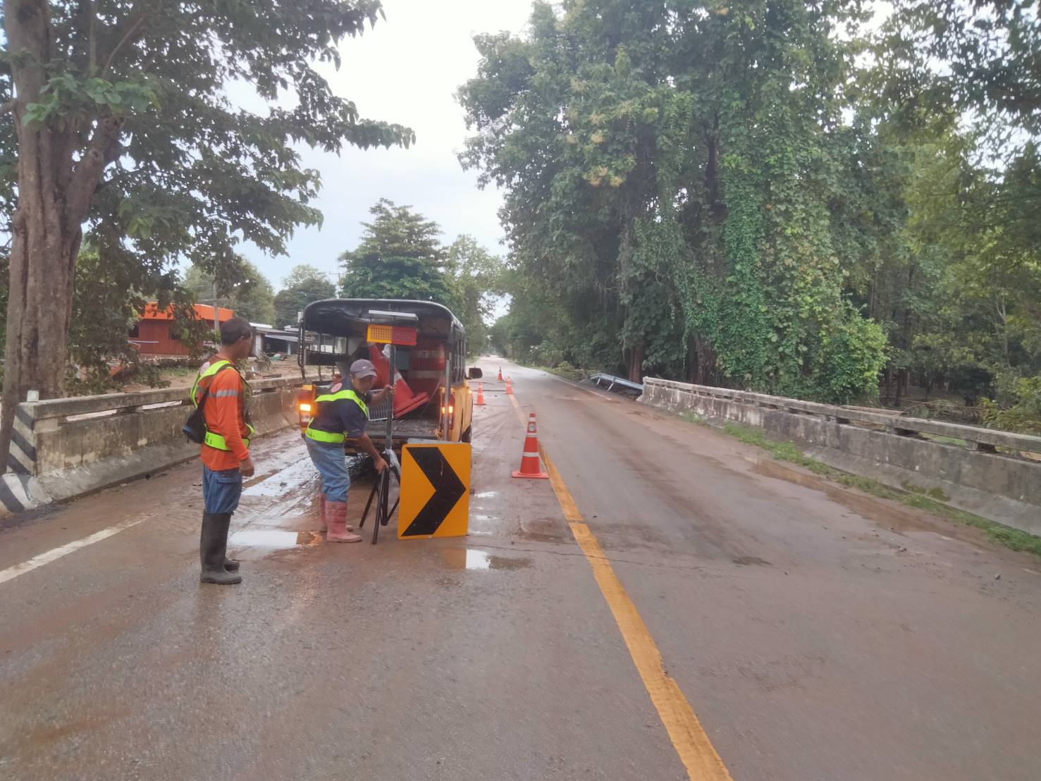 ได้ดำเนินการติดตั้งป้ายเตือน ถังยาง กรวยยาง และสัญญานไฟกระพริบ บริเวณคอสะพานจุดที่ผิวจราจรได้รับความเสียหาย จากกรณีน้ำท่วมทาง