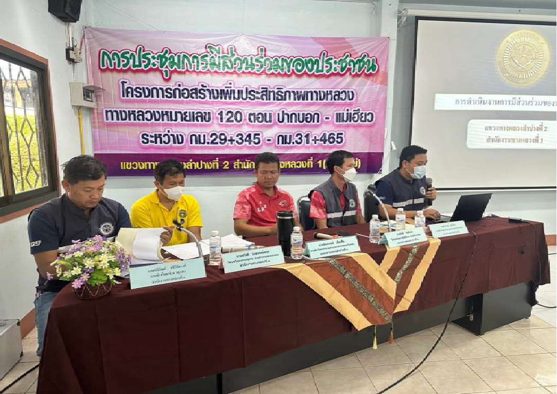 ประกาศแขวงทางหลวงลำปางที่ 2 เรื่องการประชุมการมีส่วนร่วมของประชาชนแผนการดำเนินงานการมีส่วนร่วมของประชาชน กิจกรรมก่อสร้างเพิ่มประสิทธิภาพทางหลวง งานก่อสร้างเพิ่มประสิทธิภาพทางหลวง ทางหลวงหมายเลข 120 ตอนควบคุม 0200 ตอน ปากบอก - แม่เฮียว ระหว่าง กม.๒๙+๓๔๕ - กม.๓๑+๔๖๕