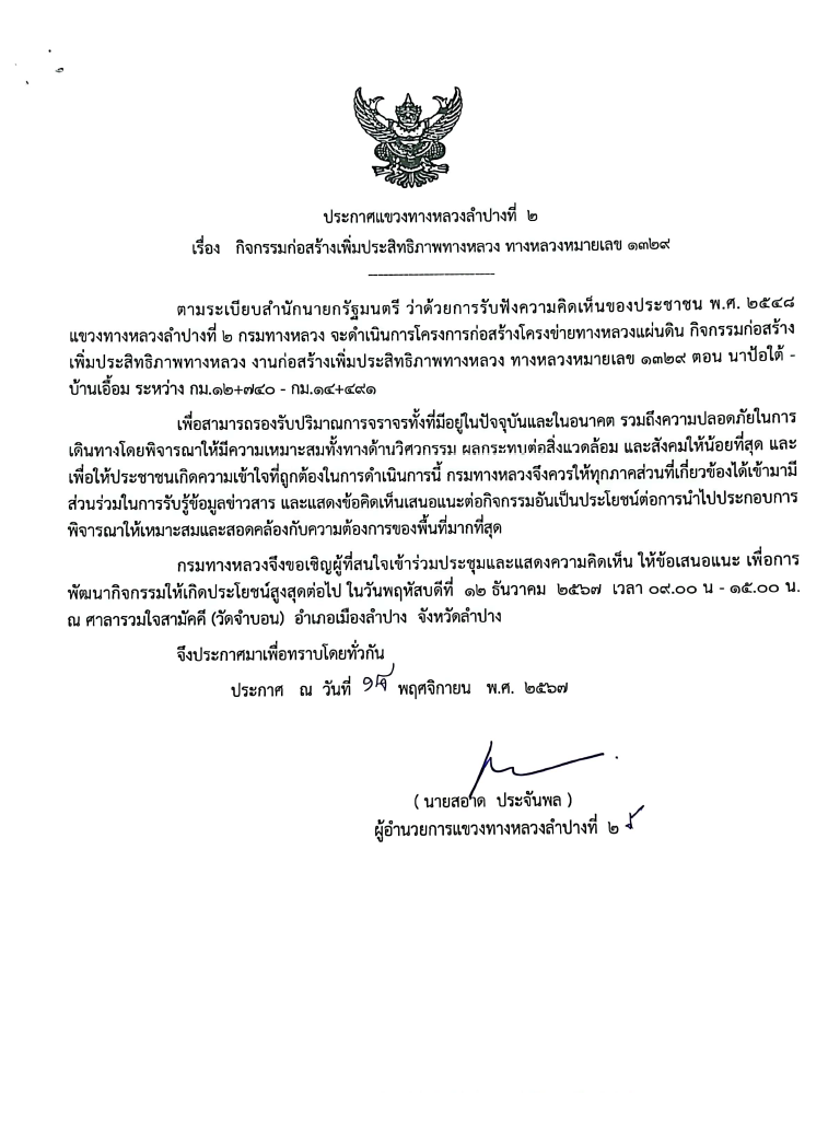 ประกาศแขวงทางหลวงลำปางที่ 2 เรื่องการประชุมการมีส่วนร่วมของประชาชน แผนการดำเนินงานการมีส่วนร่วมของประชาชน โครงการก่อสร้างโครงข่ายทางหลวงแผ่นดิน กิจกรรมก่อสร้าง เพิ่มประสิทธิภาพทางหลวง งานก่อสร้างเพิ่มประสิทธิภาพทางหลวง ทางหลวงหมายเลข ๑๓๒๙ ตอน นาป้อใต้ - บ้านเอื้อม ระหว่าง กม.๑๒+๗๔0 - กม.๑๔+๔๙๑