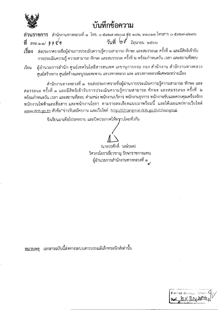 ประกาศกรมทางหลวง เรื่อง รายชื่อผู้ผ่านการประเมินความรู้ความสามารถ ทักษะและสมรรถนะ ครั้งที่ 1 และมีสิทธิเข้ารับการประเมินความรู้ความสามารถ ทักษะและสมรรถนะ ครั้งที่ 2 พร้อมกำหนดวัน เวลา และสถานที่สอบ ในตำแหน่ง พนักงานบริการ พนักงานธุรการ พนักงานขับและควบคุมเครื่องจักร พนักงานไฟฟ้าและสื่อสาร และพนักงานโยธา ตามรายละเอียดแนบมาพร้อมนี้