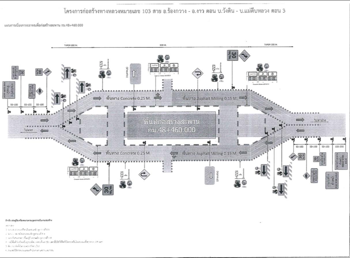 ประชาสัมพันธ์การเบี่ยงการจราจรเพื่อทำการก่อสร้างสะพานบริเวณ ทางหลวงหมายเลข 103 ตอนควบคุม 0200 ตอน แม่ตีบ - งาว ระหว่าง กม.43+000-กม.46+255.000 และ 46+585.000-กม.49+650.000 ระยะทางยาวประมาณ 6.320 กิโลเมตร