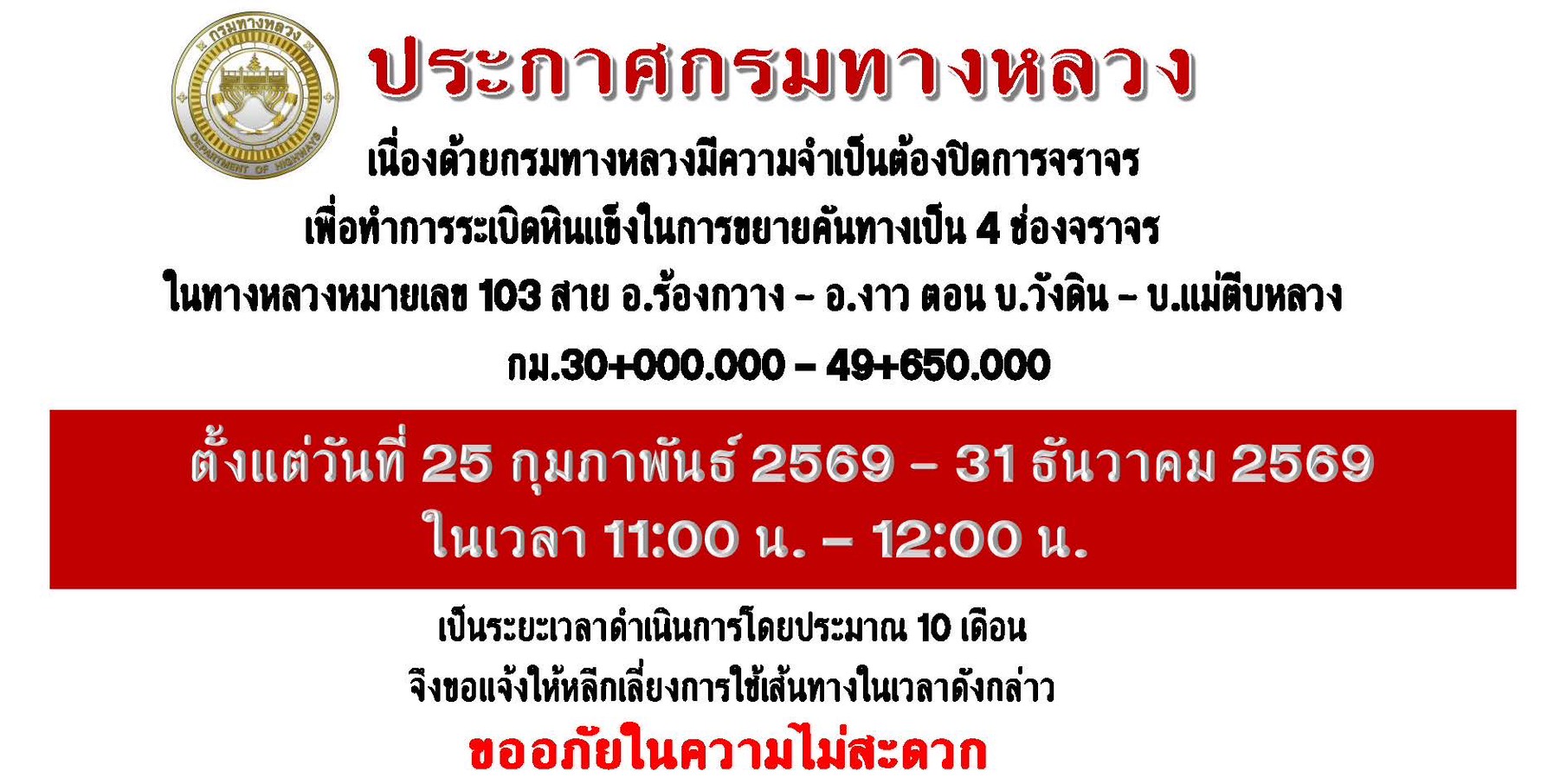 ประชาสัมพันธ์ ตั้งแต่วันที่ 25 กุมภาพันธ์ 2569 - 28 กุมภาพันธ์ 2569 ระหว่างเวลา 11.00 น. - 12.00 น. (ทุกวัน) จึงขอแจ้งปิดการจราจร ทางหลวงหมายเลข 103 สาย อ.ร้องกวาง - อ.งาว ตอน บ.วังดิน - บ.แม่ตีบหลวง จุดที่ 2 กม. กม.33+577.500-กม.33+607.500 ขอให้ผู้ใช้เส้นทางสัญจรไปมา สามารถเลี่ยงเส้นทางเข้า ทางหลวงหมายเลข 1154 (ถนนวังซ้ายสายเก่า) ขอแจ้งผู้ใช้เส้นทางสัญจรไปมาและประชาชนในพื้นที่ โปรดใช้เส้นทางด้วยความระมัดระวัง ขออภัยในความไม่สะดวก