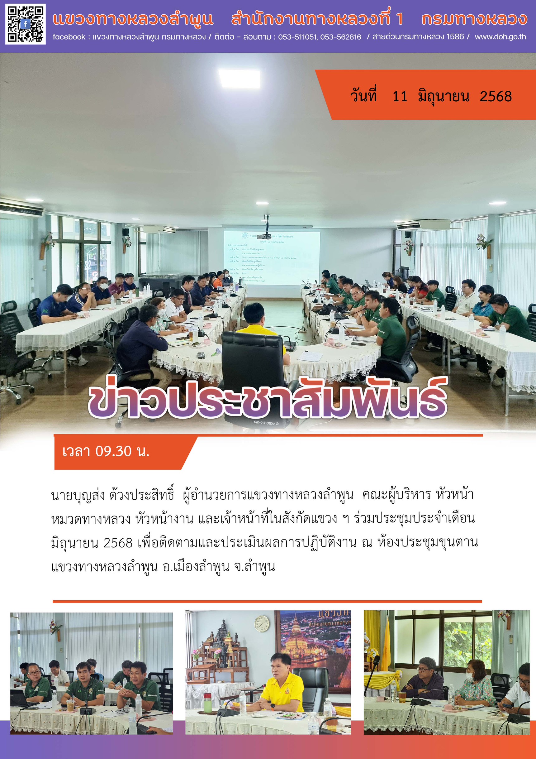 นายบุญส่ง ด้วงประสิทธิ์ ผู้อำนวยการแขวงทางหลวงลำพูน คณะผู้บริหาร หัวหน้าหมวดทางหลวง หัวหน้างาน และเจ้าหน้าที่ในสังกัดแขวงฯ ร่วมประชุมประจำเดือนมิถุนายน 2568