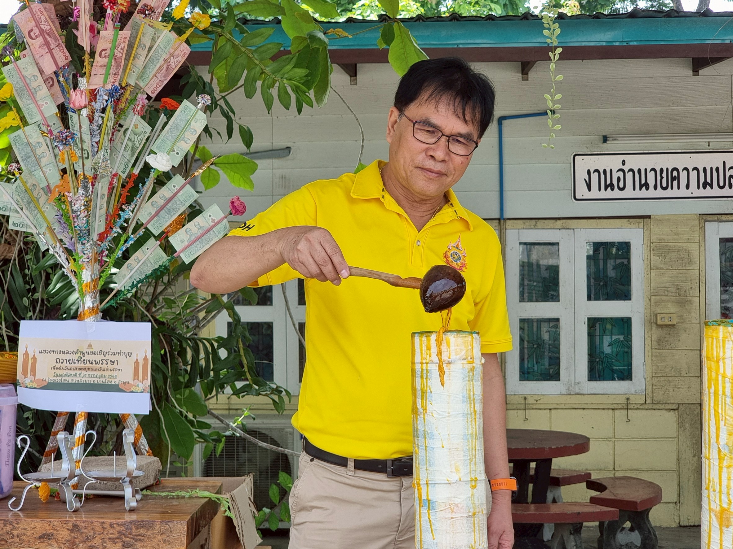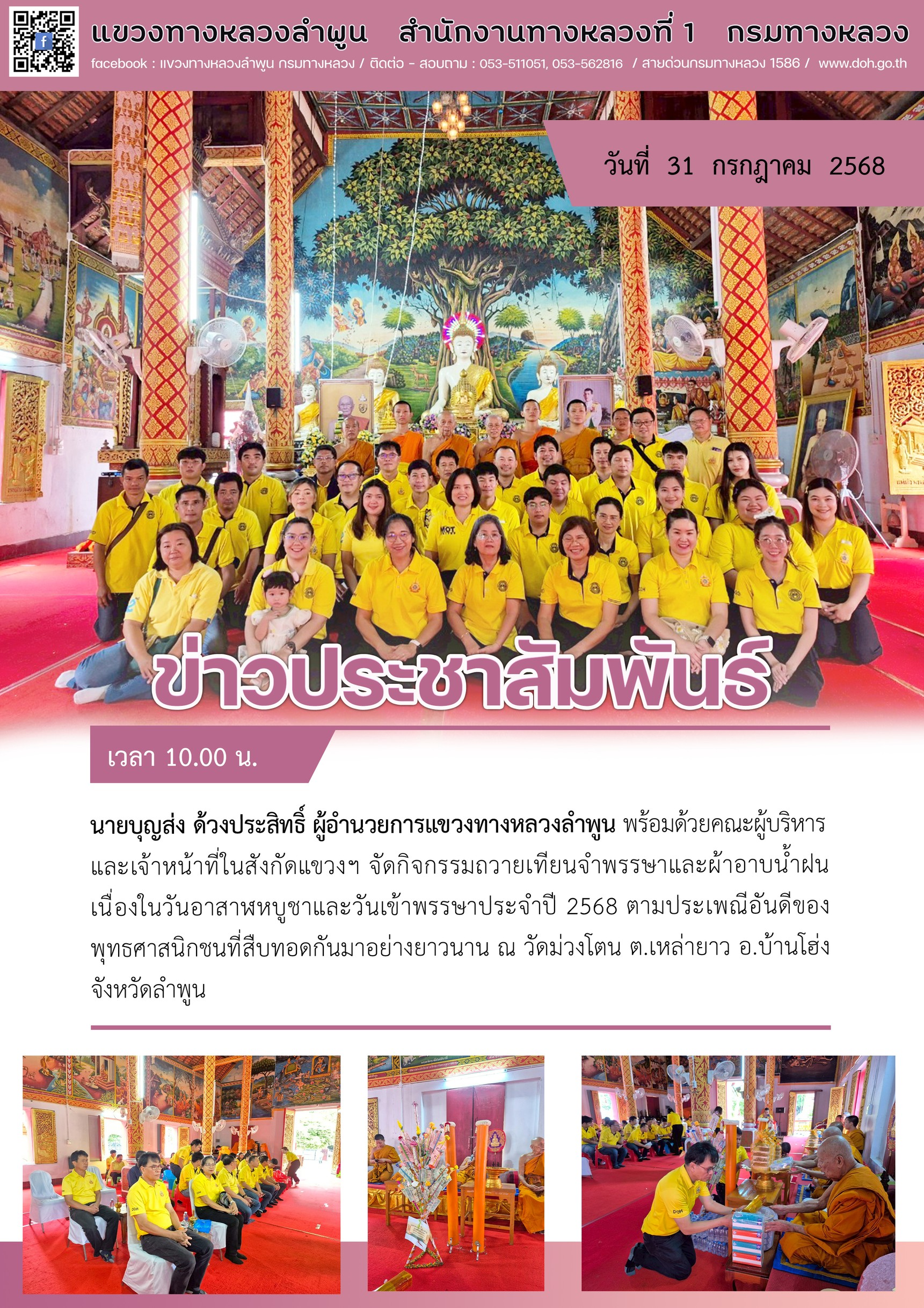 นายบุญส่ง ด้วงประสิทธิ์ ผู้อำนวยการแขวงทางหลวงลำพูน พร้อมด้วยนายอาคม จุลธง รองผู้อำนวยการแขวงทางหลวงลำพูน ฝ่ายปฏิบัติการ นายทนงค์ เอี่ยมสำอางค์ รองผู้อำนวยการแขวงทางหลวงลำพูน ฝ่ายวิศวกรรม นางเสาวภา กลิ่นมาลา รองผู้อำนวยการแขวงทางหลวงลำพูน ฝ่ายบริหาร หัวหน้าหมวดฯ และเจ้าหน้าที่ในสังกัดแขวงฯ เข้าร่วมกิจกรรมหล่อเทียนพรรษา ณ แขวงทางหลวงลำพูน และพิธีถวายเทียนพรรษาและผ้าอาบน้ำฝน เนื่องในวันเข้าพรรษา ประจำปี ๒๕๖๘ ตามประเพณีอันดีของพุทธศาสนิกชนที่สืบทอดกันมาอย่างยาวนาน ณ วัดม่วงโตน ตำบลเหล่ายาว อำเภอป่าซาง จังหวัดลำพูน เมื่อวันที่ ๓๑ กรกฎาคม ๒๕๖๘ เวลา ๑๐.๐๐ น.