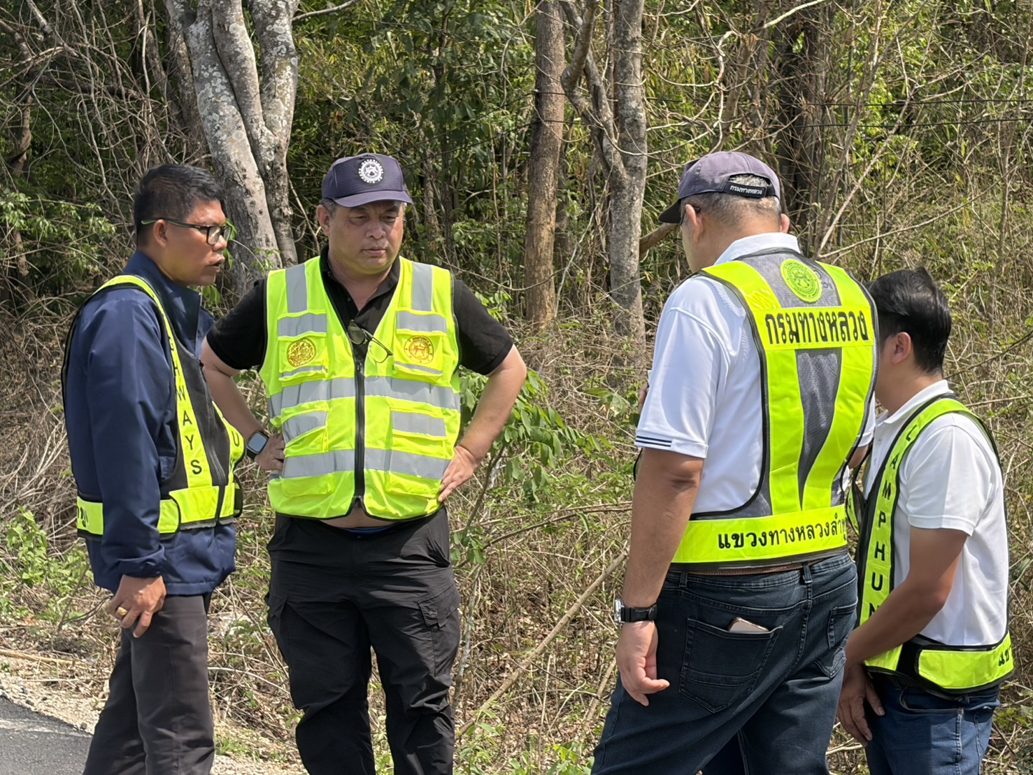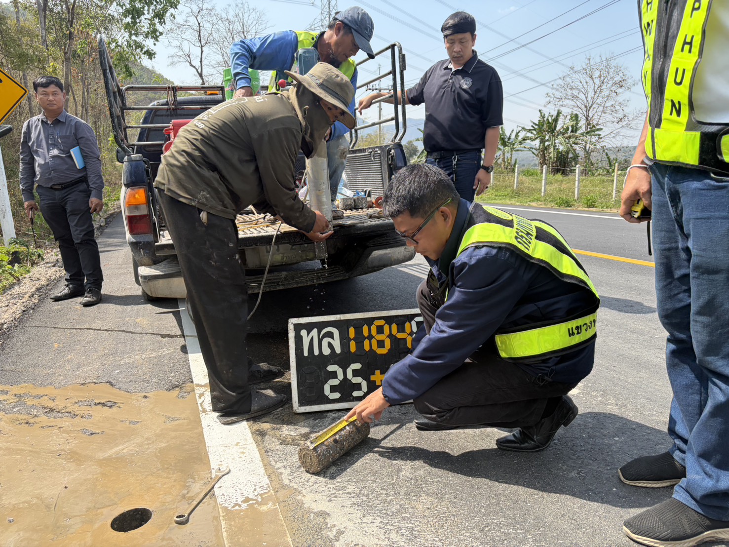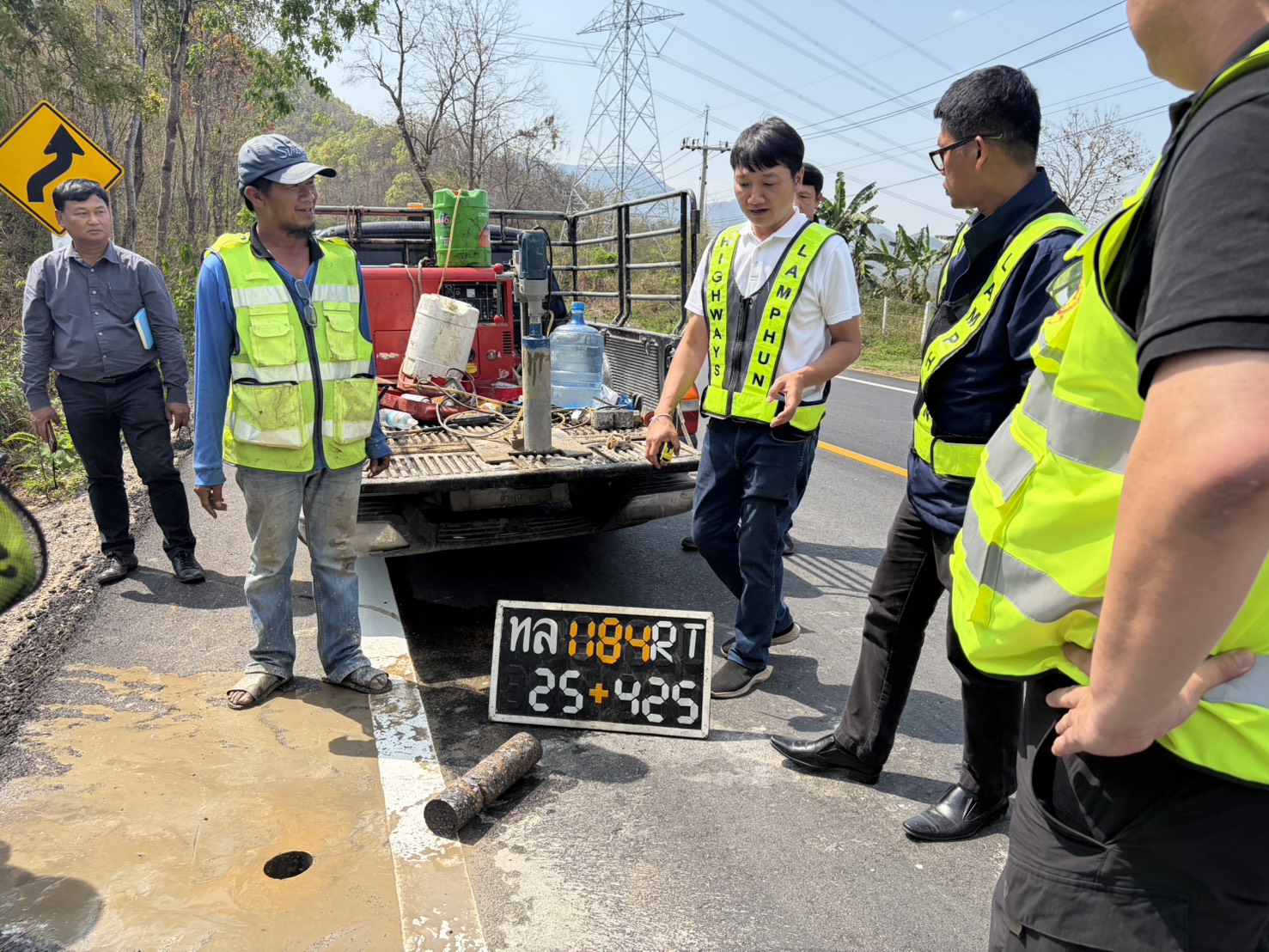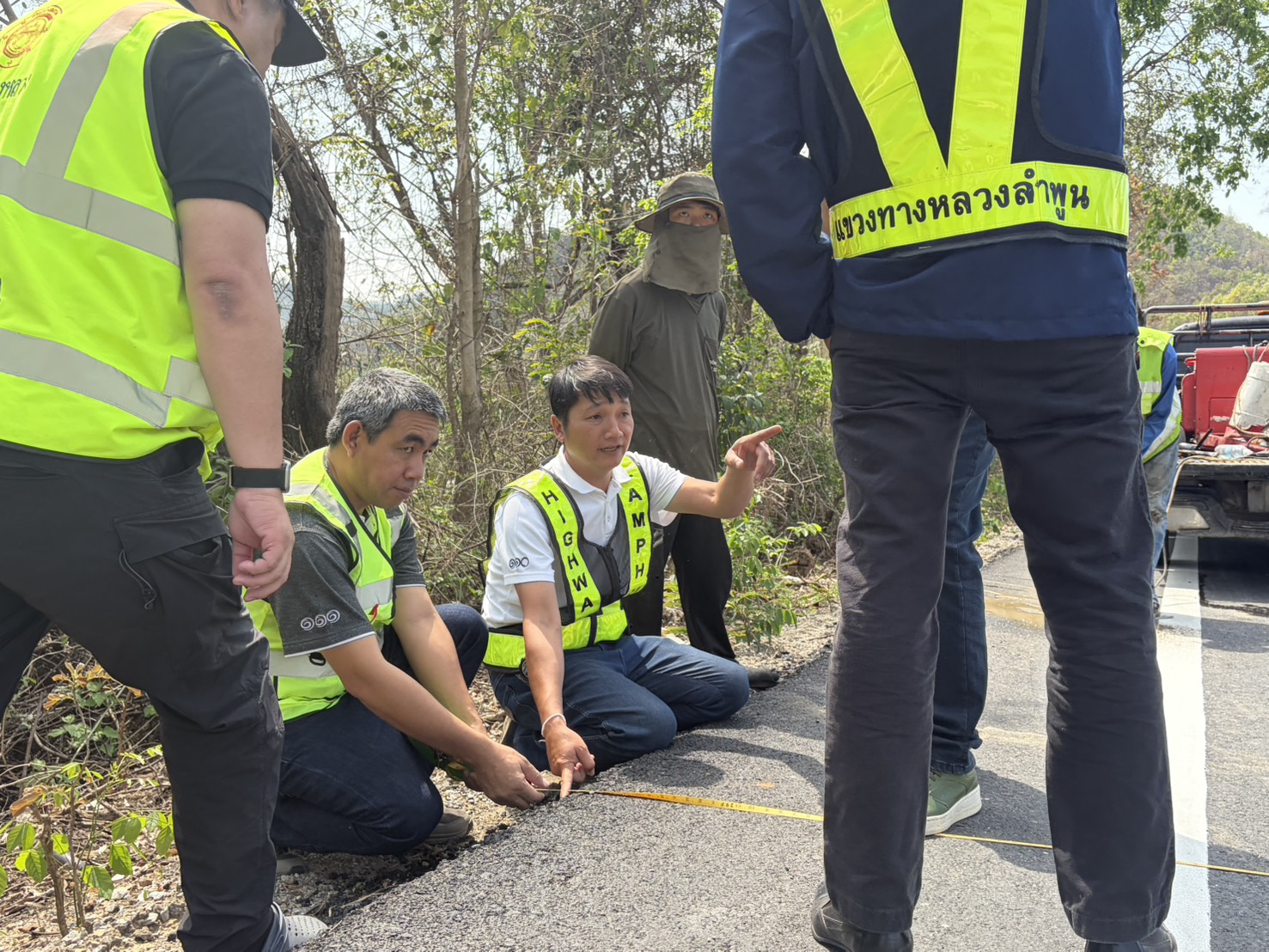 นายสมเดช โสภณดิเรกรัตน์ รองผู้อำนวยการสำนักงานทางหลวงที่ 1 นายปัญญา หวังดี ผู้อำนวยการแขวงทางหลวงลำพูน พร้อมด้วยนายทนงค์ เอี่ยมสำอางค์ รองผู้อำนวยการฯ ฝ่ายวิศวกรรม หัวหน้าหมวดทางหลวง และเจ้าหน้าที่แขวงทางหลวงลำพูน ออกพื้นที่ตรวจงานบูรณะผิวทางแอสฟัลต์ ตอน แม่อาว-ดอนมูล กม. 24+750 - กม. 27+735 อ.ทุ่งหัวช้าง จ.ลำพูน